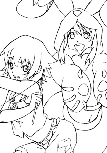 とりあえず今日のはGyaOで放送が始まった記念!と思って勢いで描いたカレイド絵!の一部分! あ、あと祝!カレイド馬鹿レンダー発売記念!!これから色塗るところです。